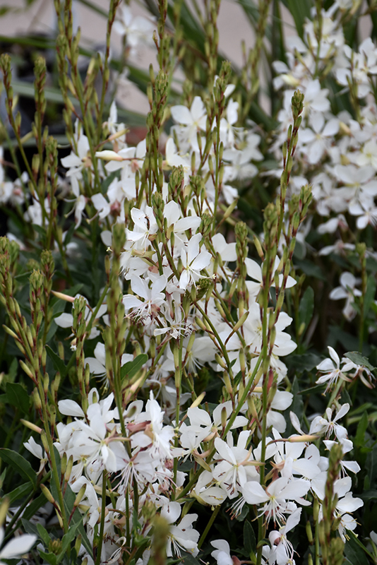 Sparkle White Gaura features airy spikes of white star-shaped flowers rising above the foliage from late spring to early fall, which emerge from distinctive pink flower buds. The flowers are excellent for cutting. Its narrow leaves remain dark green in color throughout the season.
