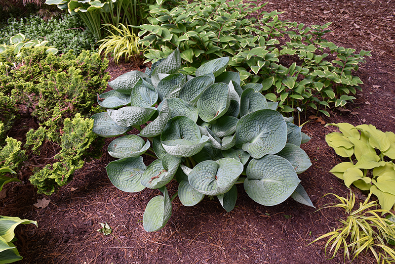 A lovely mid-sized variety featuring large mounds of thick, heavily corrugated and textured blue-green foliage; white flowers appear in the early summer on tall scapes; good slug resistance; ideal for shaded beds and borders; adds texture and contrast