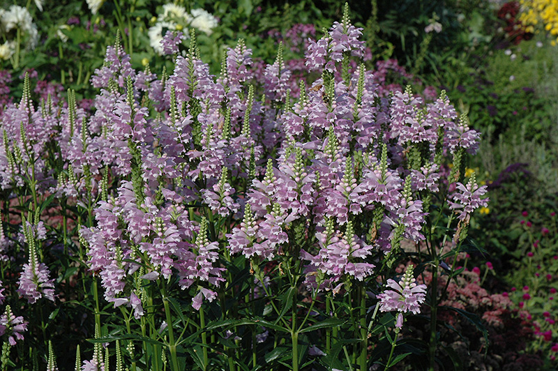 Obedient Plant will grow to be about 24 inches tall at maturity extending to 3 feet tall with the flowers, with a spread of 3 feet. When grown in masses or used as a bedding plant, individual plants should be spaced approximately 30 inches apart. It tends to be leggy, with a typical clearance of 1 foot from the ground, and should be underplanted with lower-growing perennials. It grows at a fast rate, and under ideal conditions can be expected to live for approximately 10 years. As an herbaceous perennial, this plant will usually die back to the crown each winter, and will regrow from the base each spring. Be careful not to disturb the crown in late winter when it may not be readily seen!