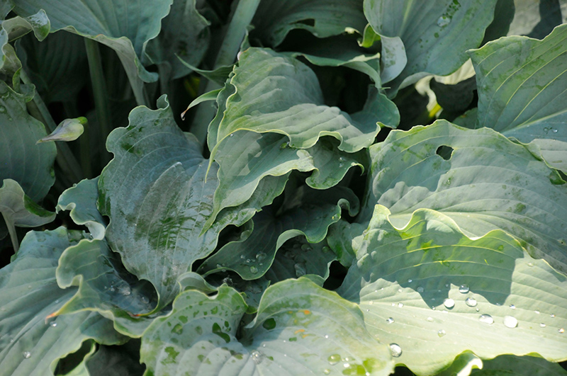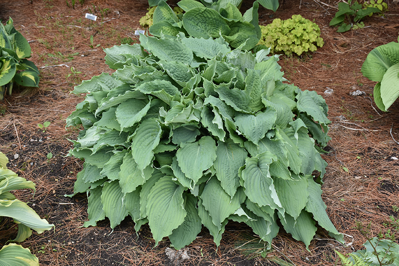 This eye catching large variety features heart shaped, silver-blue leaves with heavily ruffled margins and light gray undersides; pale lavender flowers appear in midsummer; a versatile, colorful addition to the garden or landscape