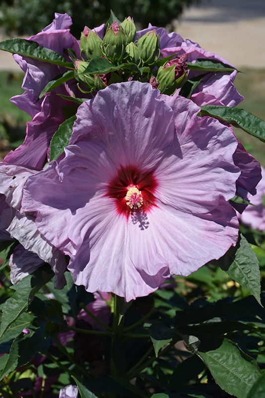 Summerific® Lilac Crush Hibiscus features bold lilac purple round flowers with lavender overtones and cherry red eyes along the stems from mid summer to early fall, which emerge from distinctive crimson flower buds. Its pointy leaves emerge coppery-bronze in spring, turning green in color throughout the season.